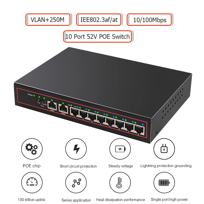 Product Name: 10 portu POE włącznik ethernet 48V sieci VLAN 10 100 mb s IEEE 802.3af w przełącznik sieciowy dla kamera ip cctv bezprzewodowy punkt dostępowy 250M Drop Shipping